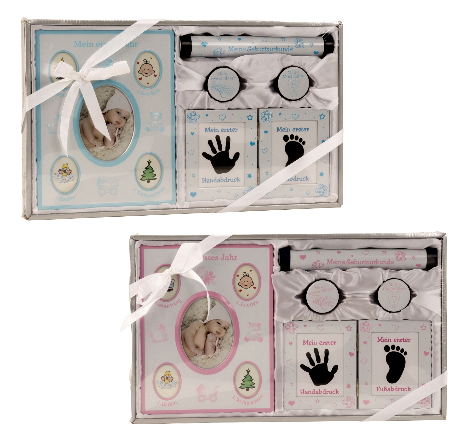 Mit diesem geschmackvollen Babyset in Blau oder Rosa machen Sie jungen Eltern garantiert eine Freude an diesem wichtigen Tag. Mit dem klappbaren Bilderrahmen, der Haardose und dem Stempelkissen für je einen Hand- und einen Fußabdruck können Mama und Papa die wichtigsten Ereignisse in den ersten Lebensmonaten ihres Nachwuchses festhalten. Für den ersten Zahn ist eine Zahndose in dem Paket inkludiert und mit der Röhre für die Geburtsurkunde können die Eltern das wertvolle Dokument sicher und auf stilvolle Art und Weise aufbewahren.