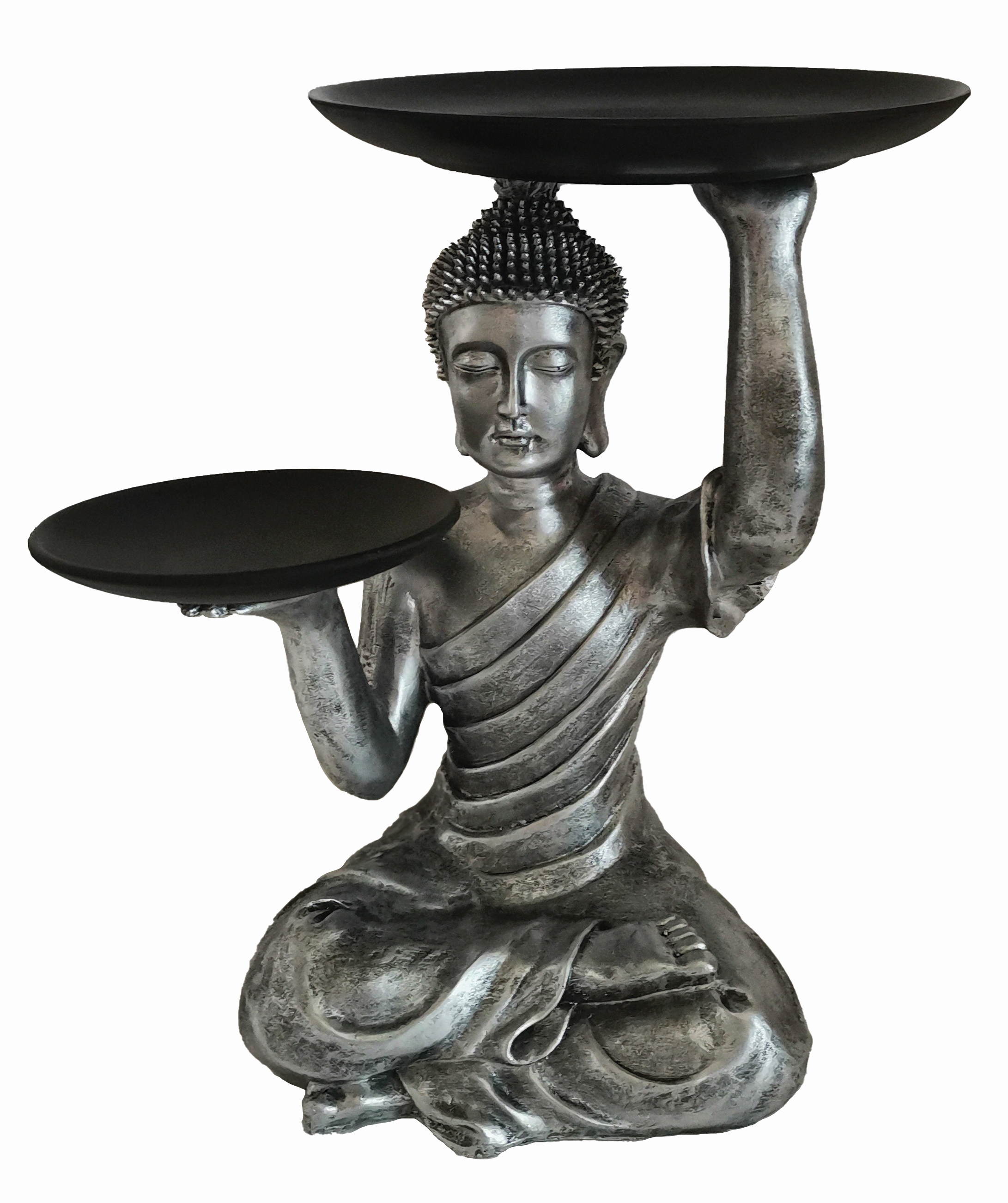 Mit der detailreich gestalteten Buddha-Statue setzen Sie einen wirkungsvollen Akzent in jedem Wohnraum. Die silberne Figur besteht aus einem pflegeleichten Material. Sie ist witterungsbeständig, sodass Sie sie auch im Außenbereich einsetzen können, um einen Lieblingsplatz ansprechend zu dekorieren.