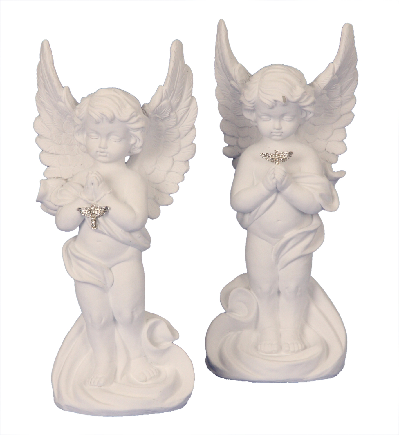 Engel sind ein klassisches Motiv für Frieden, Gelassenheit und Schutz. Die kindlichen Cherubin sind ein beliebtes Kirchenmotiv und um das leibliche und seelische Wohl der dargestellten Heiligen und Personen besorgt. Die Figuren sind durchgängig weiß gestaltet mit goldenen oder silbernen Flügeln.