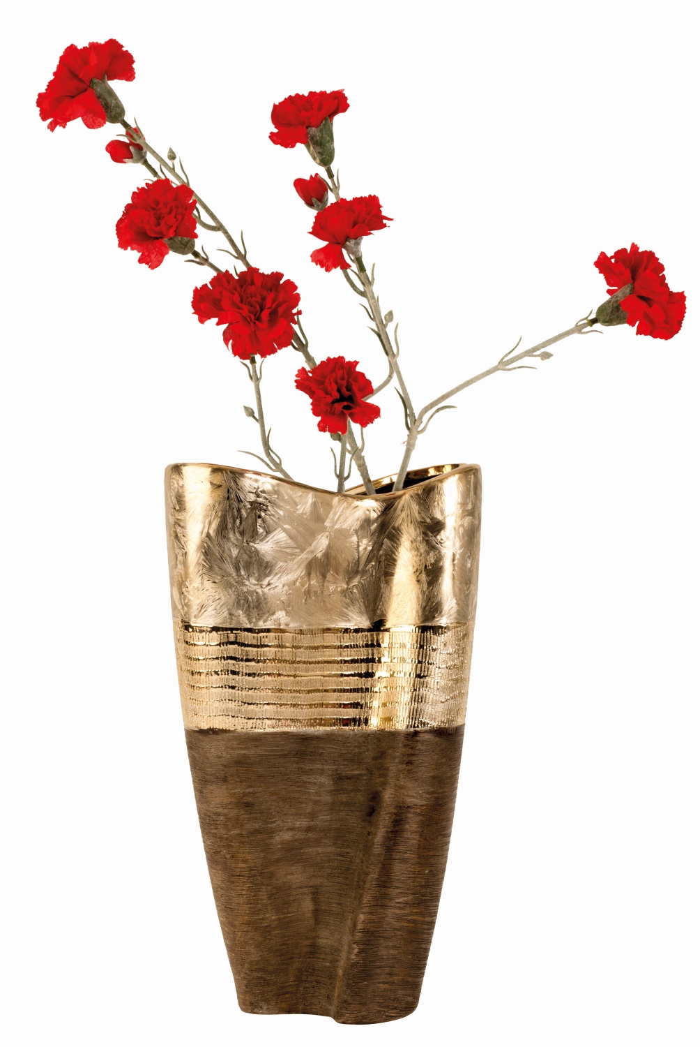 Die Designer und der Hersteller präsentieren mit dieser Vase für Blumen ein zeitloses Schmuckstück. Das optische Konzept gefällt ebenso wie die präzise und detaillierte Verarbeitung. Der untere Teil besticht mit einem angenehmen braunen Farbton, der obere Teil mit seinem goldenen Äußeren sorgt für das elegante Extra. Die drei Muster sind ein weiteres Highlight dieser Vase. In der unteren Hälfte haben sich die Designer für feine Linien entschieden, im Mittelteil für Querstreifen. Oben rundet ein goldenes Muster den optisch stimmigen Gesamteindruck ab.