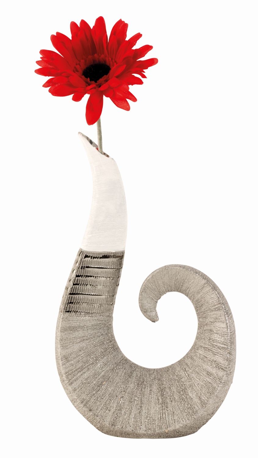 Die Designer und der Hersteller präsentieren mit dieser Vase für Blumen ein zeitloses Schmuckstück. Das optische Konzept gefällt ebenso wie die präzise und detaillierte Verarbeitung. Der untere Teil besticht mit einem angenehmen silbernen Farbton, der obere Teil mit seinem weißen Äußeren sorgt für das elegante Extra. Die drei Muster sind ein weiteres Highlight dieser Vase. In der unteren Hälfte haben sich die Designer für feine Linien entschieden, im Mittelteil für Querstreifen. Oben rundet ein weißes Muster den optisch stimmigen Gesamteindruck ab.