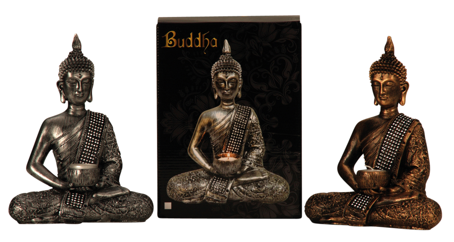 Attraktive Buddha-Figur mit Teelichthalter für den In- und Outdoor-Bereich* in bronze oder silber